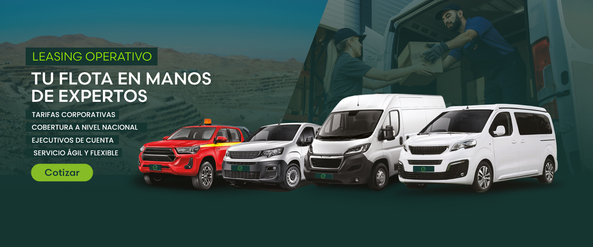 El leasing Operativo es un servicio de movilidad a largo plazo desde los 12 meses, dirigido a empresas de todo sector económico que requieran una gestión integral de flota para el desarrollo de sus operaciones a lo largo del país. Por una cuota mensual que incluye el financiamiento, costos de mantenimiento, coberturas, neumáticos y un servicio de apoyo técnico y comercial antes y durante el contrato, su empresa obtendrá una alta disponibilidad de flota para dar continuidad operacional a su negocio.